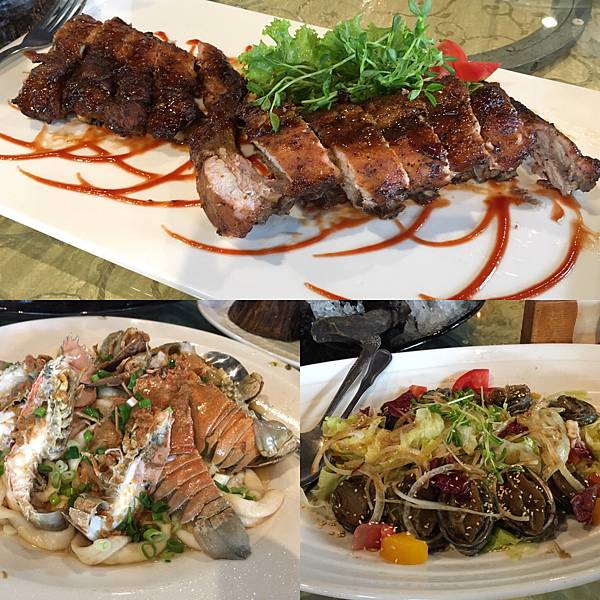接力上桌~「辛香碳烤豬肋排」難得的陸上食材以誘人的碳烤色香呈現、「嚴選當季海味-扁蝦板條」蝦鮮和著厚實富嚼勁的板條、「和風蔬果九孔鮑」以清爽和風佐白芝麻輕鬆的點綴九孔鮑的鮮味兒~~