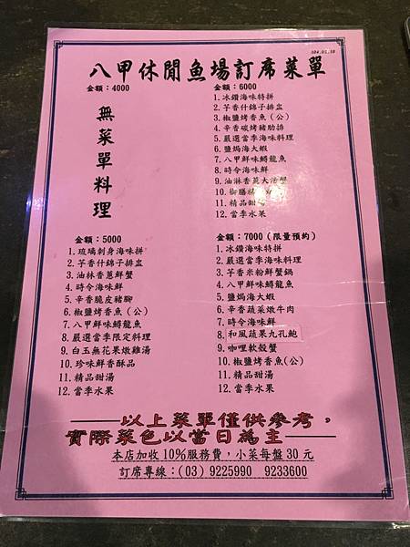 八甲魚場的桌菜有四種價位可任君挑選,我們今天嚐鮮的是$7,000的菜色組合,以這樣用料紮實又澎湃的海鮮辦桌料理而言實屬平價海味啊!